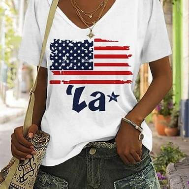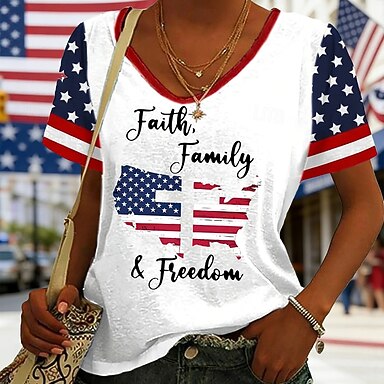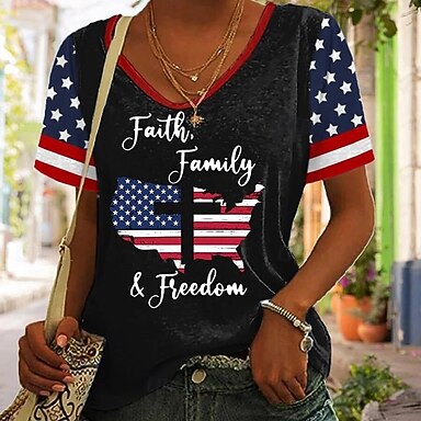 Dia da Independência Camiseta Patriótica Feminina Impressão Gráfica Bandeira Vintage Estilosa Clássica Manga Curta Decote em V Tops Regulares Dia a Dia Azul Preto Vermelho Verde Verão Primavera