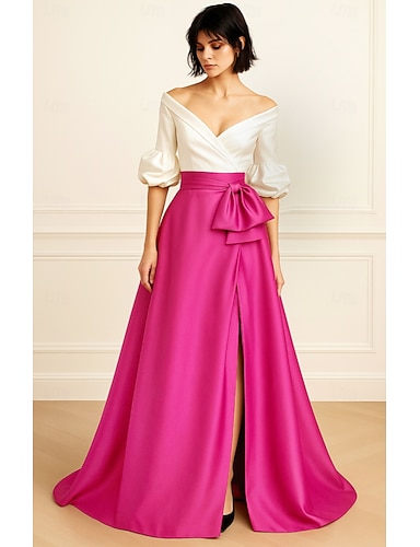 Linha A Longo Vestidos de noite Vestido formal Elegante Split alta Manga 3/4 Ombro a Ombro Casamento Formal Cetim com Laço(s)