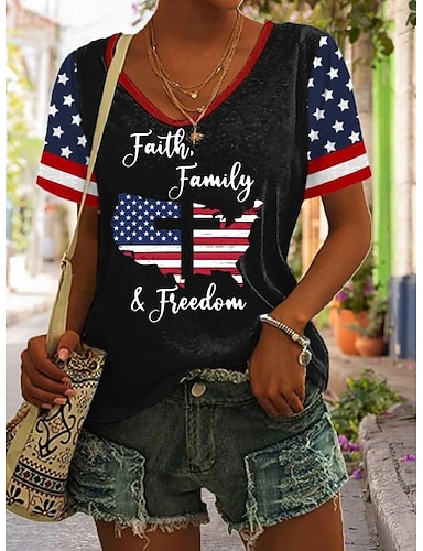 Dia da Independência Americana Mulheres Camiseta Imprimir Gráfico Bandeira Vintage à moda Clássico Manga Curta Decote V Tops regulares Diário Preto Branco Vermelho Azul Marinha Verão Primavera