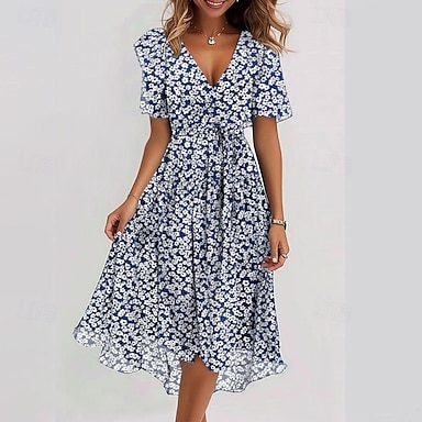 Mulheres Vestido maxi longo Vestido casual Vestido A Line Vestido estampado Moda Moderno Ao ar livre Praia Férias Normal Floral Manga Curta Decote V Azul Rosa Roxo Cinzento Verão Primavera