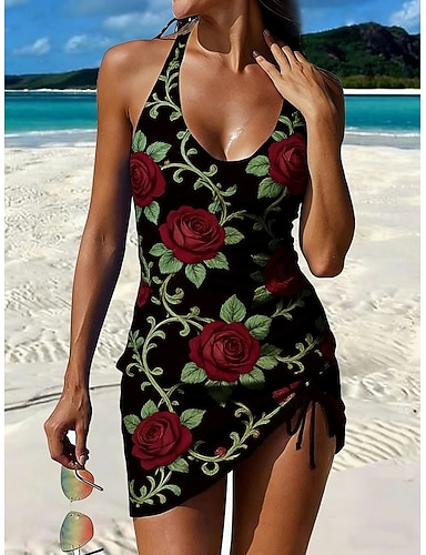 Mulheres Roupa de Banho Tankini 2 partes Saia roupa de banho Com Cordão Nadador Elegante Férias Floral Scoop pescoço Sem Manga Fatos de banho