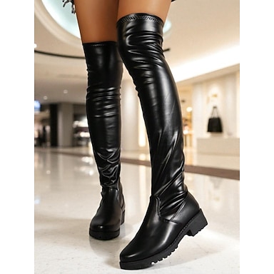 Botas femininas pretas acima do joelho com biqueira de couro envernizado – botas altas elásticas casuais e chiques para uso diário, festas e moda de rua