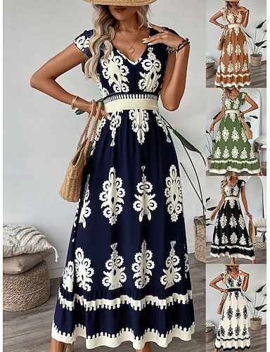Mulheres Vestido Longo Vestido Boho Vestido antigo Vestido casual Elegante Moda Moderno Ao ar livre Praia Férias Normal Gráfico Manga Curta Decote V Preto Amarelo Azul Marinha Verde Verão Primavera