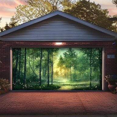 floresta encantada, magia, árvores verdes brilhantes, luz solar, névoa, lagoa, natureza, paisagem, porta de garagem, banner, mural externo, decoração de parede, jardim, exterior de casa, cenário de