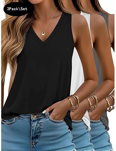 Pacotes múltiplos 3 pecas Mulheres Decote V Sem Manga Preto + branco + cinza Tanque camisa sem manga T-shirt Côr Sólida Casual Diário Poliéster Verão