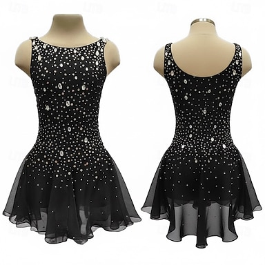Vestidos para Patinação Artística Mulheres Patinação no Gelo Vestidos Preto Patchwork Barra Assimétrica Com Stretch Treino Competição Roupa para Patinação Clássico Cristal / Strass Sem Manga