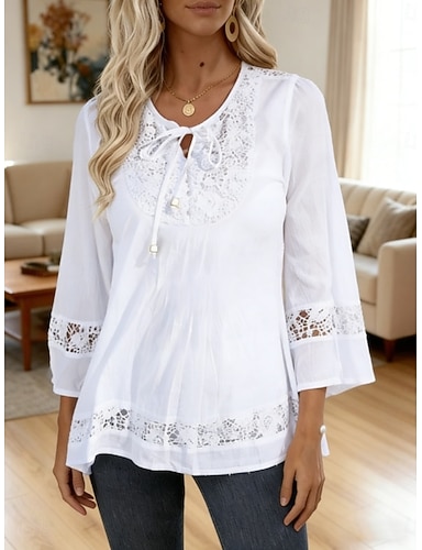 Mulheres Camisa Popover camisa de verão Camisa casual Blusa Renda Patchwork Côr Sólida à moda Casual Manga 3/4 Gola Redonda Tops regulares Diário Feriado Preto Branco Vinho Azul Marinha Verão