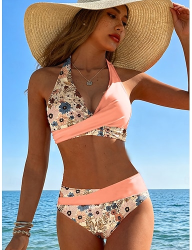 Maiô Feminino Bikini 2 Peças Cheeky Slim Costas Nuas Roupas de Praia para Férias Gráfico Color Block Halter Neck Sem Mangas