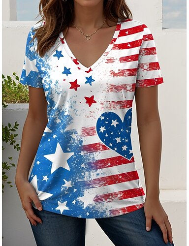 Dia da Independência Americana Mulheres Camiseta Imprimir Gráfico Bandeira Vintage à moda Clássico Manga Curta Decote V Tops regulares Diário Azul Branco Vermelho Verão Primavera