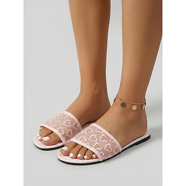 Sandálias femininas românticas rosa com detalhes de coração em tela - chinelos rasteiros bordados delicados, perfeitos para férias em hotéis de luxo e escapadas para a praia. &relaxamento em um resort