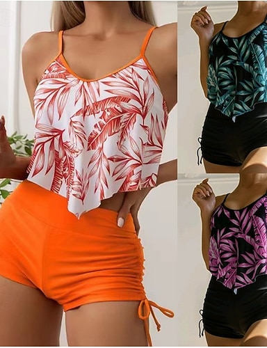 Tankini Feminino 2 Peças Maiô Palm Boy Leg Controle de Barriga Cintura Alta Slim Costas Descobertas Roupas de Praia para Férias Floral Folhas U Neck Sem Mangas