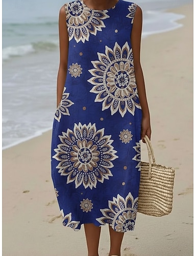 Mulheres Vestido midi Vestido casual Vestidos Para o Verão Vestido de turno Vintage Diário Ao ar livre Férias Ajuste Largo Floral Sem Manga Gola Redonda Azul Verão Primavera