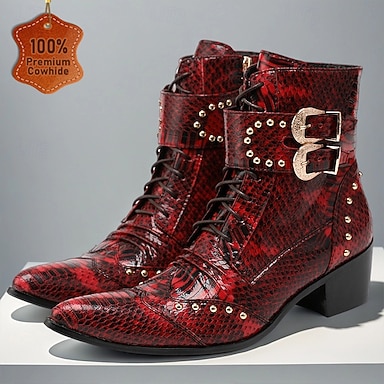 Botas masculinas vermelhas de couro sintético com estampa de cobra e bico metálico – calçados ousados e elegantes para festas de Natal e reuniões formais