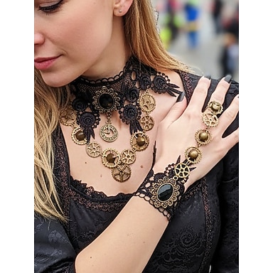 Conjunto de colar e pulseira choker de renda preta steampunk para mulheres do Mardi Gras - Penda de engrenagem e relógio em liga para cosplay gótico carnaval e festas de Halloween