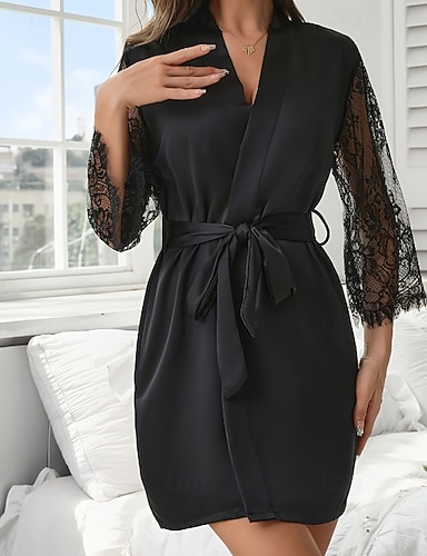 Mulheres manto Casual Macia Seda Cor imaculada Franzido Cordões Diário Casa De Cama Manga Longa Decote V Preto Branco Champanhe Rosa Vinho Verão Primavera Normal
