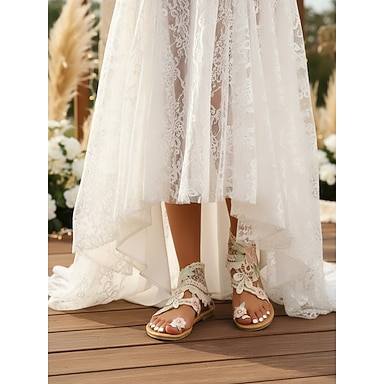 Sandálias rasteiras femininas em renda branca marfim, elegantes sapatos de noiva boho para casamento na praia.