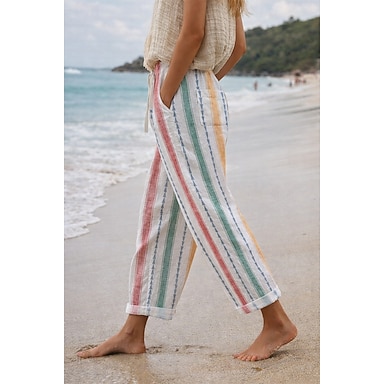 Mulheres Linho de algodão sintético Calças Calça verão Roupa de rua Casual Comprimento total Natural Floral Tecido Listrado Bolsos Estampado Design de cordão elástico Confortável Exterior Roupa