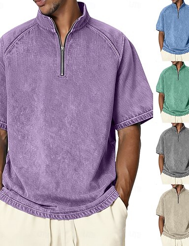 Homens Camisa jeans Camisa 100% algodão com lavagem ácida T-shirt Manga Curta Colarinho Chinês Outono & inverno Verão Primavera Tecido Vintage Roupa de rua Casual Zip Up Zíper Tingimento em peça