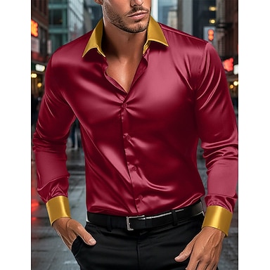 Homens Camisa Social Blusa de cetim Saia Camisa casual camisa de botão Camisa de formatura Tecido Formal Casamento Preto Vermelho Azul Royal Dourado Manga Longa Lapela Todas as Estações Roupa Bloco