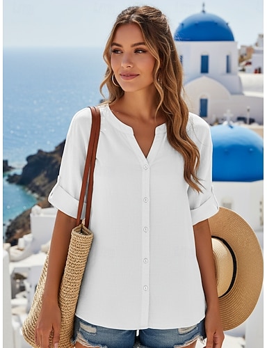Mulheres Camisa Social Camisas de algodão e linho Blusa Botões Tecido à moda Meia Manga Decote V Tops regulares Diário Feriado Para Noite Preto Branco Amarelo Azul Marinha Laranja Verão Primavera