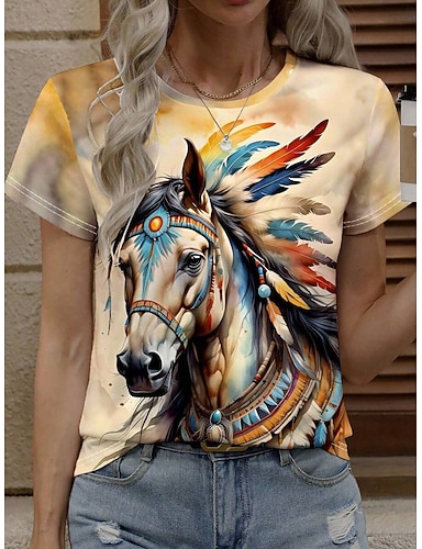 Mulheres Camiseta Imprimir Gráfico Animal Cavalo à moda Clássico Casual Manga Curta Gola Redonda Decote Redondo Tops regulares Diário Branco Amarelo Rosa Verão Primavera