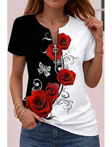 Mulheres Camiseta Zíper Quarter Zip Gráfico Geométrica Listrado Tropical Havaiana à moda Manga Curta Gola Redonda Decote V Tops regulares Diário Esportes Para Noite Branco Rosa Verão Primavera