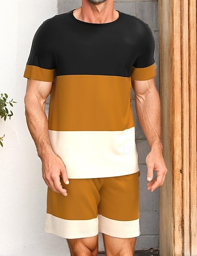 Homens Ternos-Camiseta Conjuntos de camisa e calça Roupas de 2 peças Manga Curta Crewneck Verão Bloco de cor Moda Casual Patchwork 2 Peças Férias Roupa Diária Para Noite Preto Cinzento Top Tee para