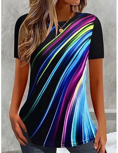 Mulheres Camiseta T-shirt Imprimir Listrado Moda à moda Clássico Manga Curta Gola Redonda Tops regulares Diário Para Noite Final de semana Azul Rosa Verão Primavera