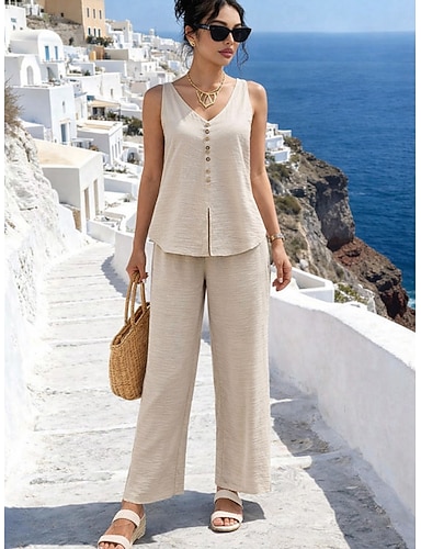 Mulheres Conjuntos de calças Linho de algodão sintético Sem Manga Decote V Côr Sólida Elegante Moda Roupa de rua Casual Diário Ao ar livre Azul Preto Branco Verão Ajuste Largo