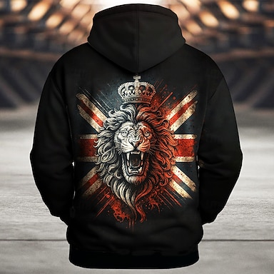 Homens Bandeira Leão UK Moletom Esportes Moda Manga Longa Gola Redonda Ao ar livre Escritório Streetwear Preto Azul Com Cordão 3D Outono Inverno Designer S M L XL XXL XXXL