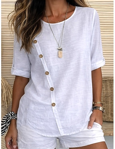 Mulheres Blusa Camisa de linho sintético Botões Côr Sólida à moda Casual Manga Curta Gola Redonda Tops regulares Diário Branco Verão Primavera