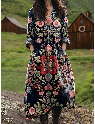 Vestido Maxi Boho Feminino Vestido de Verão Vestido Casual Aniversário Diário Feriado Ajuste Solto Gráfico Floral Geométrico Manga Longa Decote em V Preto Azul Laranja Primavera Outono