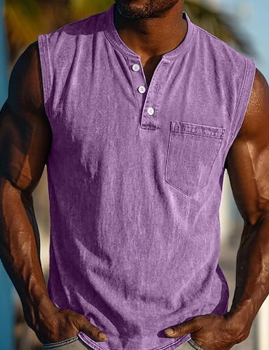Homens Malha Íntima Top de colete Camiseta Interior Camisa 100% algodão com lavagem ácida Sem Manga Henley Verão Tecido Moda Designer Básico Bolsos Botões Casual Férias Rua Azul Preto Verde Claro Top
