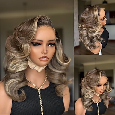 Peruca de cabelo humano virgem brasileiro, ondulado, loiro acinzentado com mechas multicoloridas, lace front 13x4 com baby hair, corte bob curto sem cola, peruca com lace closure 5x5 para mulheres.