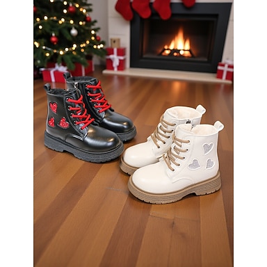 Botas infantis de couro com corações decorativos e cadarços vermelhos - calçado aconchegante para o inverno e para as festas de fim de ano.