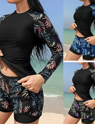 Tankini Feminino 2 Peças Maiô Palma Cintura Alta Controle de Barriga Cintura Alta Slim Férias Praia Vestuário Floral Folhas Decote Redondo Mangas Longas