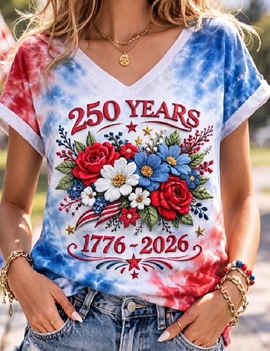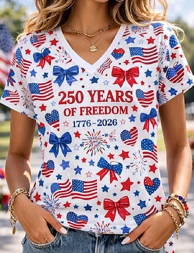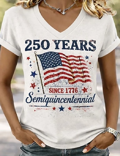 Dia da Independência T-Shirt Patriotica Feminina Gráfica Bandeira Vintage Estilosa Clássica Manga Curta Decote em V Tops Regulares Diário Fim de Semana Estampada Preto Branco Cinza Verão Primavera