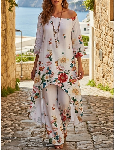 Mulheres Conjuntos de calças Manga 3/4 Decote Redondo Floral Gráfico Elegante Férias Casual Diário Férias Vermelho Azul Real Roxo Verão Normal