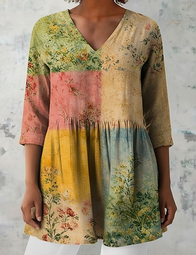Mulheres Blusa Imprimir Floral Férias Diário Casual Manga 3/4 Decote V Tops regulares Diário Feriado Para Noite Azul Azul Real Roxo Verde Verão Primavera Outono