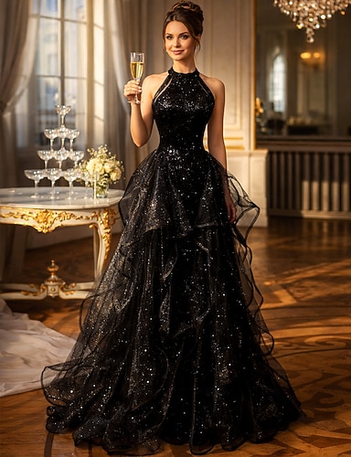 Linha A Longo Vestidos de baile Brilhante Princesa Sem Manga Sem Alças Baile de Formatura Formal Tule com Purpurina