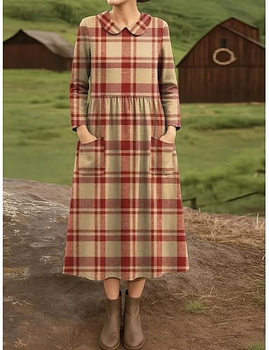Mulheres Vestido midi Vestido da bainha vestido plissado Férias Casual Boho Feriado vestido de primavera Normal Xadrez Manga Longa Gola Redonda Azul Vermelho Azul Céu Laranja Primavera Outono