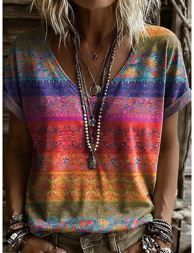 Mulheres Camiseta Imprimir Gráfico Geometria Vintage à moda Clássico Manga Curta Decote V Tops regulares Diário Para Noite Final de semana Azul Roxo Verão Primavera