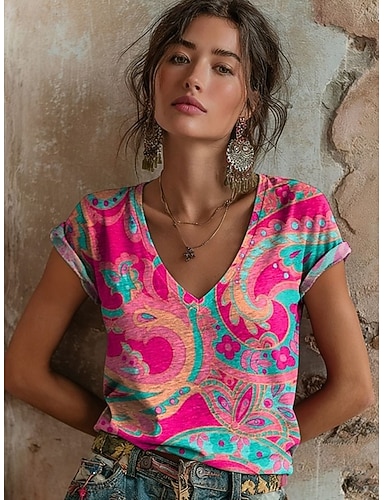 Mulheres Camiseta Imprimir Floral Gráfico Vintage à moda Clássico Manga Curta Decote V Tops regulares Diário Cinza Amarelo Laranja Rosa cor de Rosa Verão Primavera