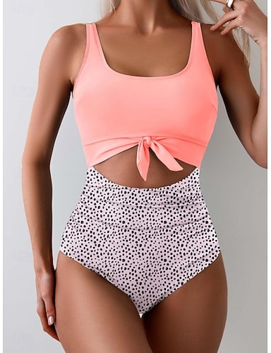 Maiô Feminino de Uma Peça Sexy Monokini com Recortes Controle de Barriga Alta Fina Costas Nuas Roupas de Praia de Férias Estampa Poá Bloco de Cor U Decote Sem mangas