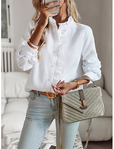 Mulheres Camisa casual camisa de botão Blusa Frufru Botões Côr Sólida Elegante à moda Casual Manga Longa Colarinho Chinês Tops regulares Diário Ao ar livre Trabalho Azul Preto Branco Rosa Verão