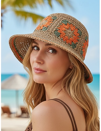 Chapéu de sol feminino estilo boho, multicolorido, dobrável, perfeito para férias na praia e resorts, e para uso casual no dia a dia.