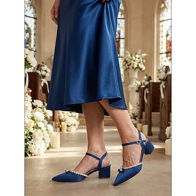 Sapatos de salto bloco com tira de pérolas azul-marinho para mulheres - elegantes sapatos para a mãe da noiva em casamentos na igreja.