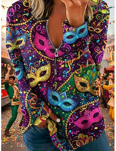 Blusa Feminina do Mardi Gras Linho Semelhante Respirável Leve Gráfica Vintage Estilosa Diária de Manga Longa V Neck Tops Regulares Estampa do Dia das Férias Amarelo Roxo Verde Verão Primavera