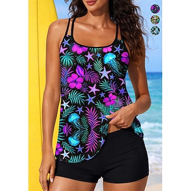 Tankini Feminino 2 Peças Maiô Briefs de Leopardo Controle de Barriga Cintura Alta Slim Costas Nuas Praia de Férias Floral Scoop Neck Sem Mangas