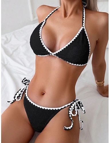 Biquíni Feminino 2 Peças Com Pregas Colorblock Estilo Cheeky Slim Costas Descobertas Elegante Roupas de Praia de Férias Listrado Decote Halter Sem Mangas